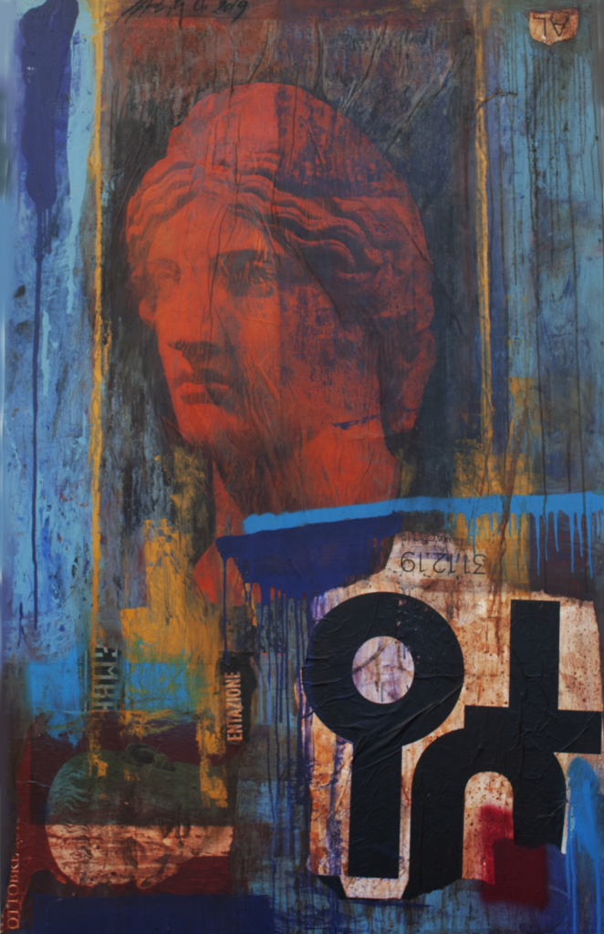 Deturpazione di un feticcio, azione di strappo e ricostruzione rispetto alla verità di un’immagine. Deturpare nella sua accezione positiva significa per l’artista aggiungere e strappare frammenti, ritornare su un trascorso mai dimenticato del Tempo. Così un profilo ellenico, forse miceneo, emerge dal colore per poi fuggire mescolandosi tra le pieghe dell’ombra.